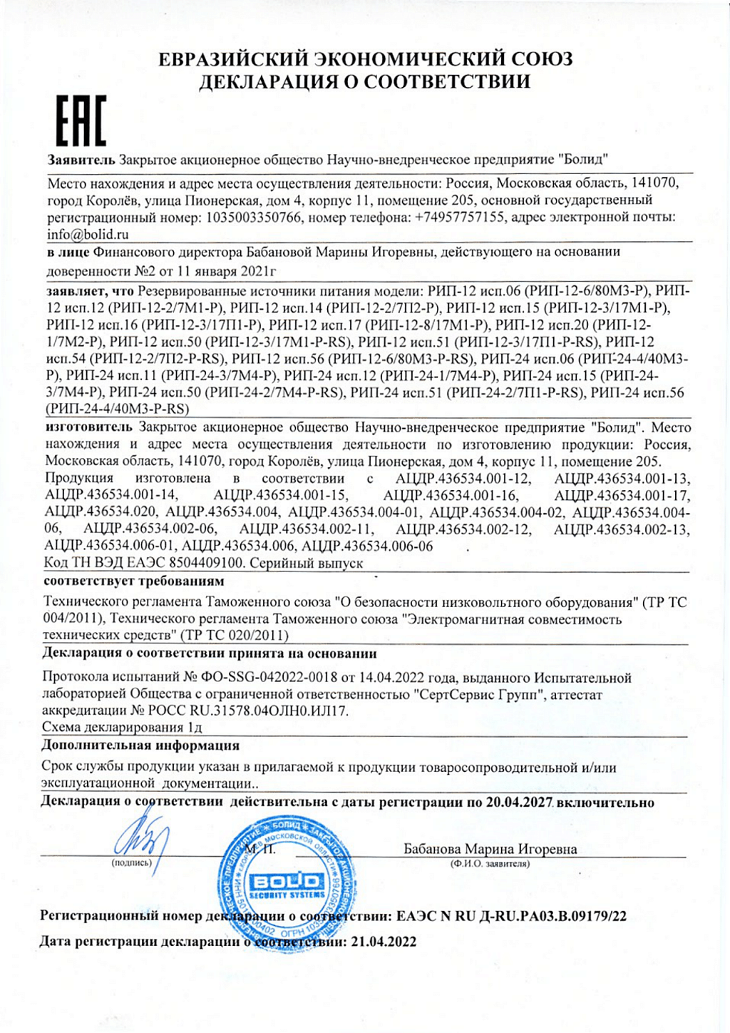 Декларация о соответствии Блок питания РИП-24-4/40М3-Р (исп.06) BOLID