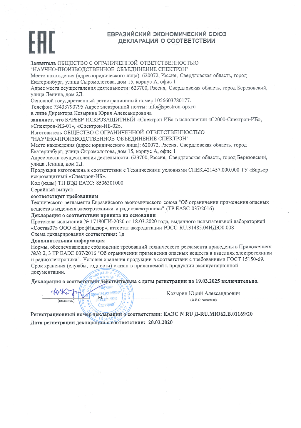 С-2000-Спектрон-ИБ используется для создания искробезопасной двухпроводной линии связи (ДПЛС) контроллеров "С2000-КДЛ" и "С2000-КДЛ-2И", при подключении к ним адресных устройств с видом взрывозащиты "искробезопасная цепь (i)".Прибор предотвращает возникновение электрической искры в цепях, размещаемых во взрывоопасных зонах. Искробарьер относится к связанному электрооборудованию группы II и предназначен для установки вне взрывоопасной зоны, относится к устройствам активного типа. Особенности прибора: создание искробезопасной ДПЛС; подключение адресных устройств с искробезопасной цепью "С2000-Спектрон-607-Exi" и "С2000-Спектрон-608-Exi"; установка на DIN-рейку. Предотвращает возникновение электрической искры в цепях, размещаемых во взрывоопасных зонах.