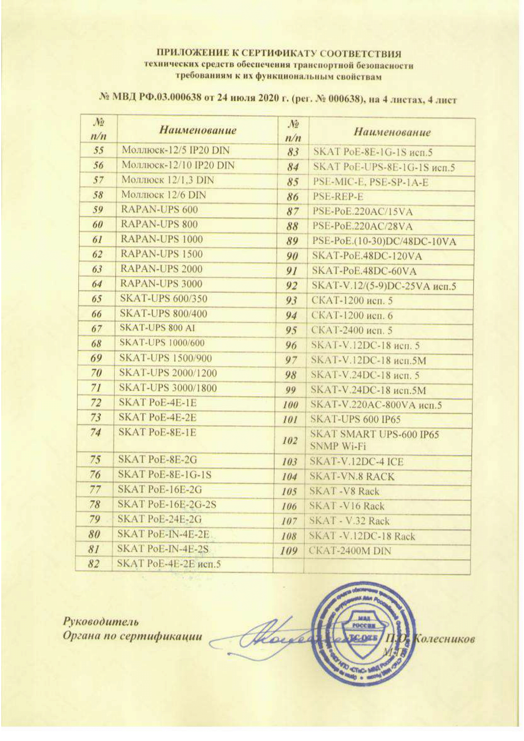 Сертификат соответствия Источник питания SKAT-UPS 1000-IN-2x7 ИБП 220В 600Вт 2 АКБ 7Ач внутр. меандр. стаб-я напр-я Бастион (лист 4)