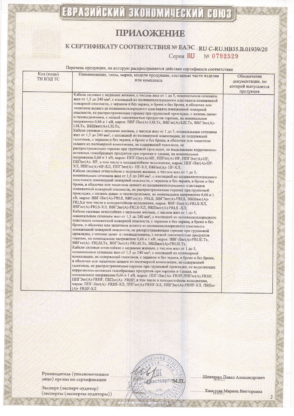 Кабель с медными однопроволочными токопроводящими жилами, с термическим барьером в виде двух слюдосодержащих лент, с изоляцией и оболочками (внутренней и наружной) из ПВХ-композиции пониженной пожароопасности с низким дымогазовыделением. Предназначен для передачи и распределения электроэнергии в стационарных установках.